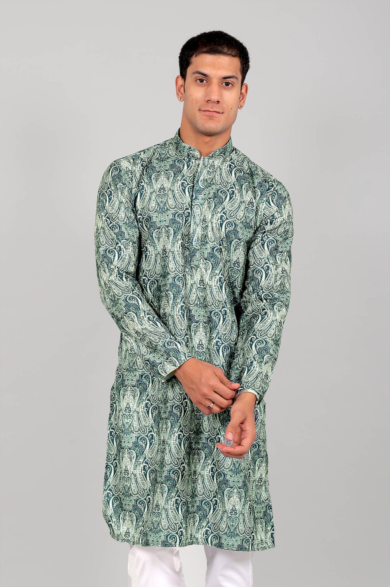 Style Tip: Combine this kurta with black trousers and polished loafers. Add a metallic brooch or watch for that refined finishing touch.