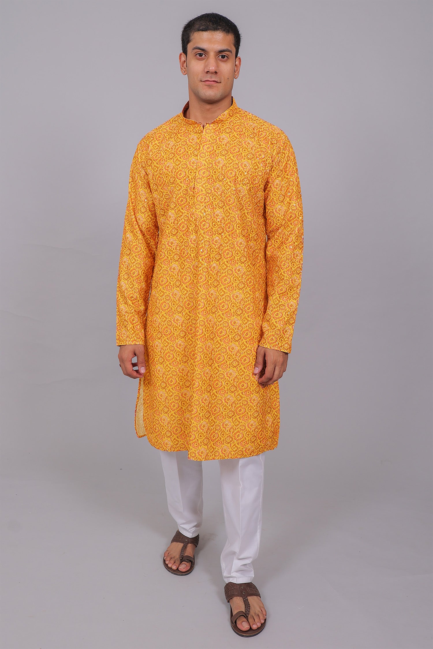2. BlueSaanchi Men’s Chikankari Threadwork & Sequin Kurta Set (Yellow-Pink)
