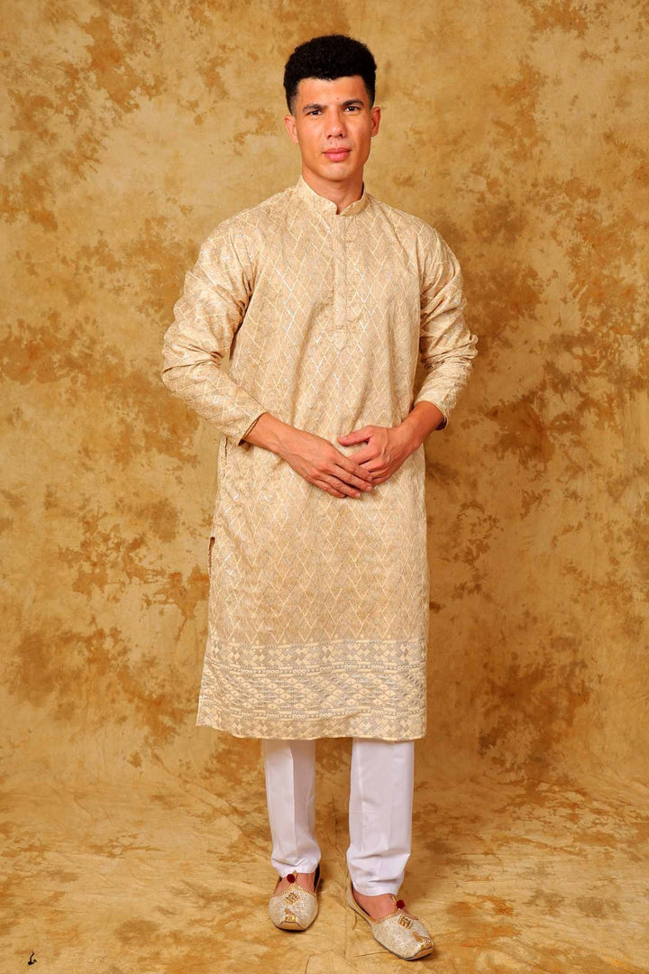 For those who prefer a premium, textured look, this Matka silk kurta set is a timeless choice. The fabric’s natural sheen adds sophistication, making it ideal for both grooms and guests.