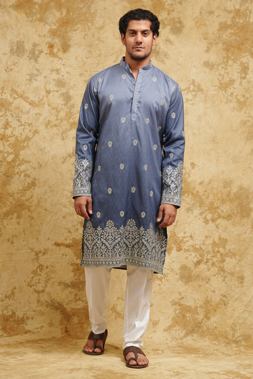 Refined, festive, and visually striking—this Blue Ombre Kurta Set is crafted on a self-butti woven fabric with a smooth ombre gradient, enhanced by golden and white thread embroidery that creates an elegant foil-effect sheen. The embroidered vines and elephant border add richness, making it ideal for evening festivities, engagements, and cultural celebrations. Finished with a premium polyester blend and cotton interlining for all-day comfort and sharp structure.