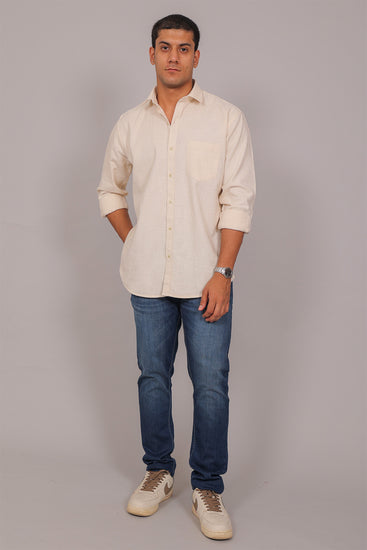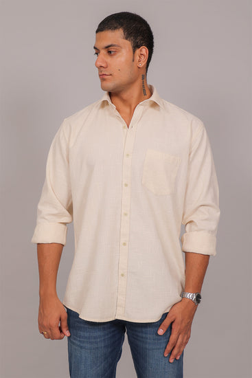 Versatile and elegant, this Cream Herringbone Texture Shirt offers subtle charm with its textured weave. A perfect option for semi-formal gatherings, it blends comfort with effortless sophistication.