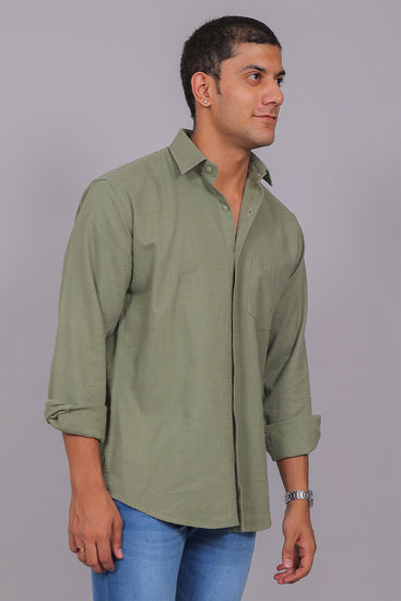 Elevate your wardrobe with this Olive Green Herringbone Texture Shirt. The subtle woven texture adds depth and character to the fabric, while the classic collar and front pocket ensure versatility for both casual outings and semi-formal settings.