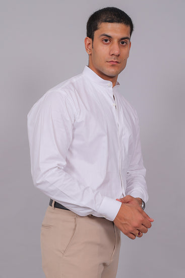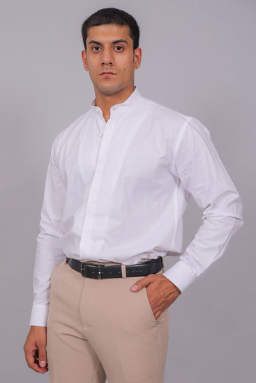 Refined and minimal, this White Shirt with Facing Design offers a modern take on everyday classics. With its crisp mandarin collar and tailored finish, it delivers sophistication while maintaining all-day comfort.