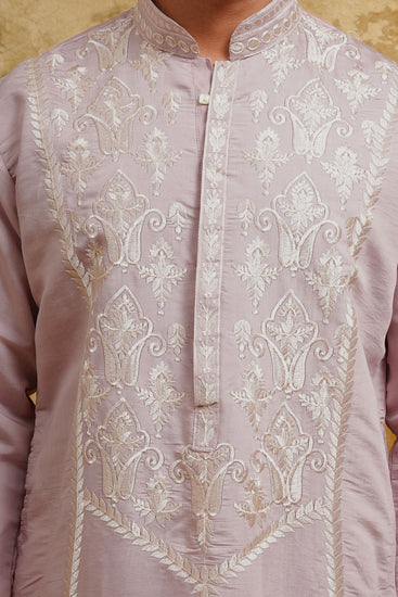 Soft, elegant, and artistically detailed—this Blush Pink Ornate Thread-Embroidered Kurta brings a refined charm to festive dressing. The pastel pink base sets a serene tone, while the front panel showcases intricate tonal embroidery in a blend of paisley, floral, and geometric motifs. The V-shaped embroidered yoke elongates the torso and adds a beautifully structured look, making the kurta both flattering and luxurious.