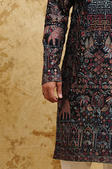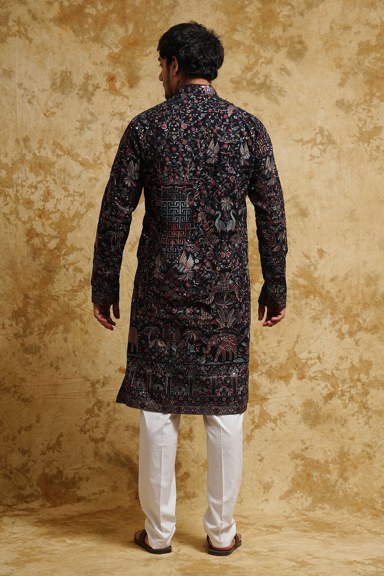 Step into refined elegance with this Dark Blue Kashmiri Polyester-Blend Kurta Set, crafted to showcase heritage Kashmiri artistry in a modern, comfortable silhouette. The kurta features an all-over Kashida-inspired digital print filled with traditional motifs—chinar leaves, floral vines, paisleys, Mughal patterns, and intricate borders. The rich dark blue base enhances the detailed multi-color artwork, giving the outfit a regal, festive appeal. The 100% cotton interlining ensures added comfort and structure, making it a perfect choice for long wedding events and celebrations.
