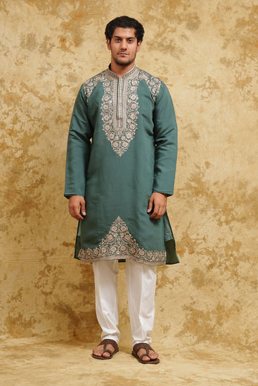 Opulent, timeless, and steeped in heritage—this Emerald Regal Zari-Thread Mughal Motif Embroidered Kurta brings the grandeur of classic craftsmanship into a contemporary festive silhouette. The neckline features dense, intricately layered embroidery inspired by traditional Mughal patterns, rendered in soft metallic threads that glow beautifully against the rich emerald base. Matching motifs on the shoulders and a statement architectural design along the hem add impeccable balance and symmetry, giving the garment a royal, hand-crafted aura. The smooth, structured fabric enhances the kurta’s polished elegance, making it a standout choice for high-profile festive occasions and traditional ceremonies. Finished with a mandarin collar and a detailed placket, it exudes quiet luxury from every angle.