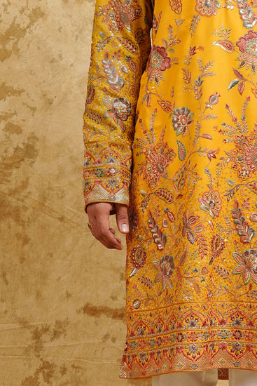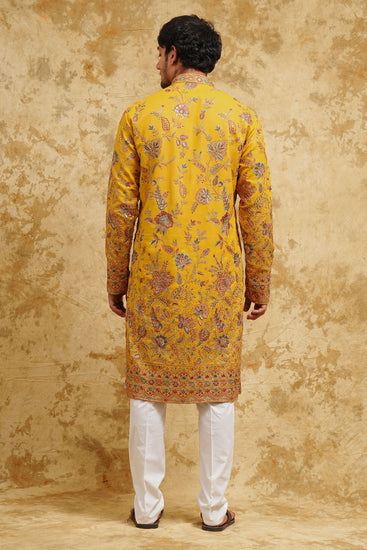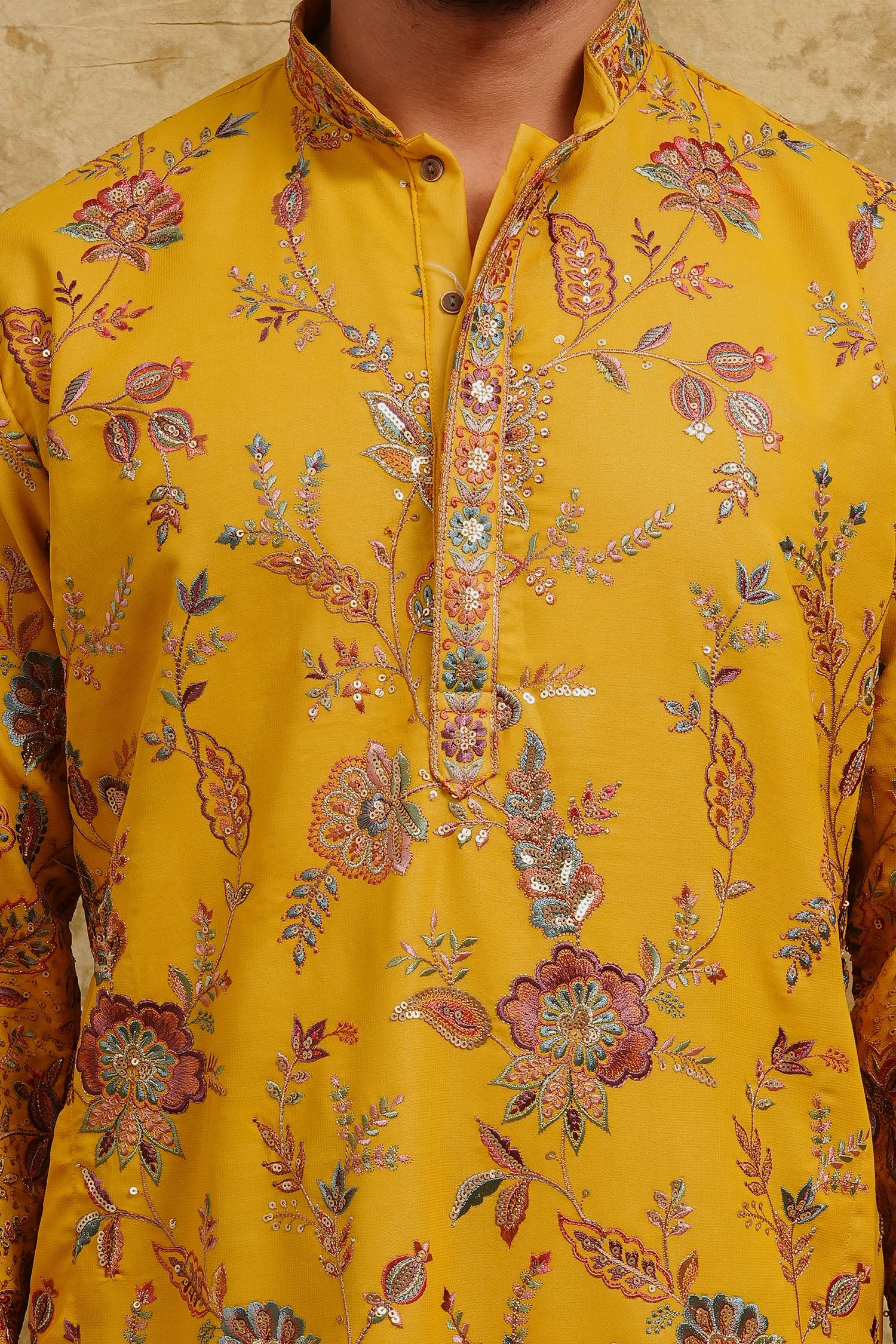 Vibrant, intricate, and undeniably festive—this Marigold Meadow All-Over Multicolor Thread-Embroidered Kurta brings together rich traditional artistry with a lively, celebratory palette. The detailed floral motifs bloom across the fabric in soft pinks, greens, and blues, creating a tapestry-like effect that feels both regal and refreshing. The hemline and sleeves feature denser, border-style embroidery that adds depth and craftsmanship to the piece. With its warm marigold base, the kurta radiates joyful energy—perfect for occasions where you want to stand out with tasteful elegance. A classic mandarin collar and embellished placket complete the look with refined traditional charm.
