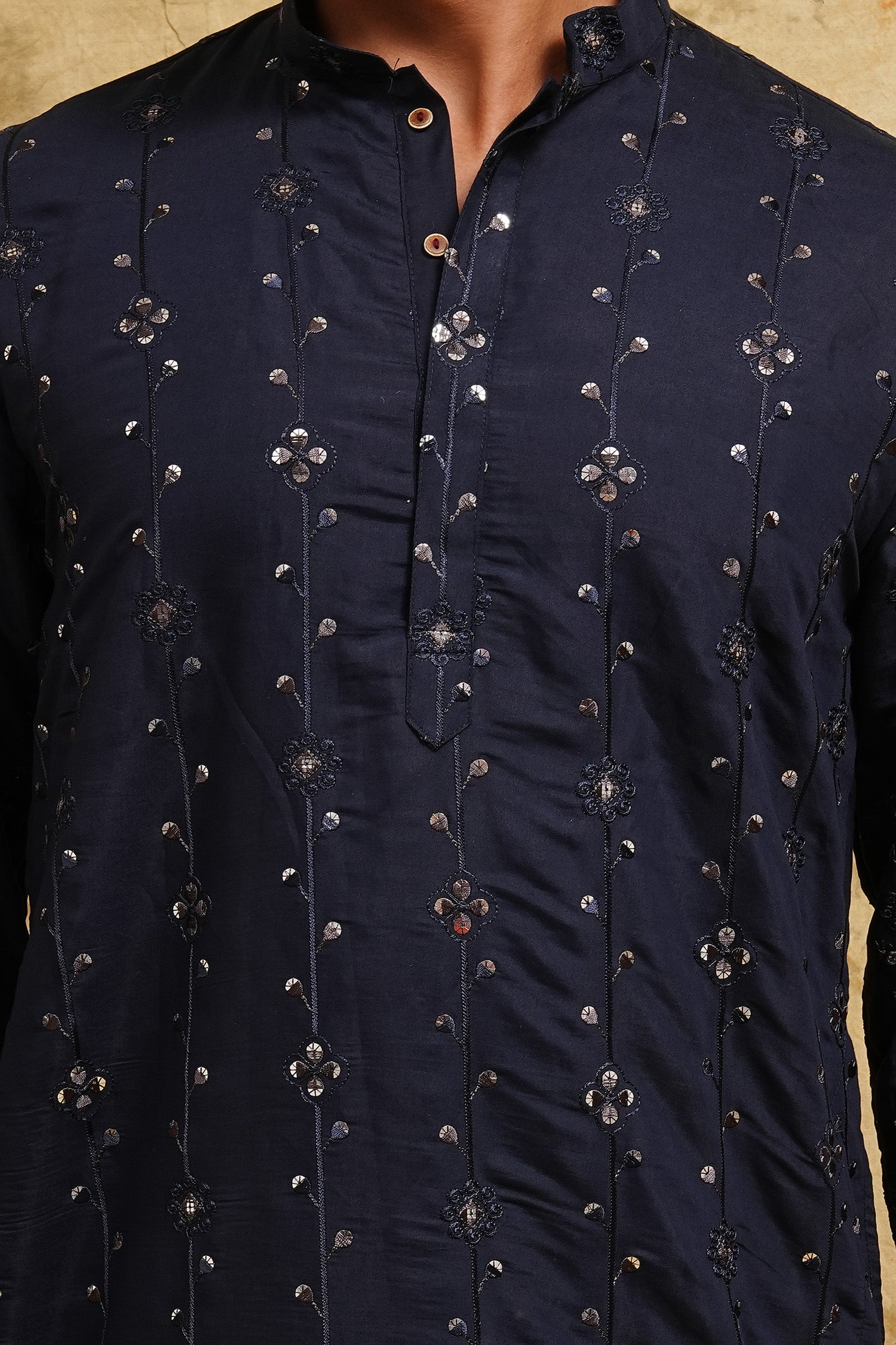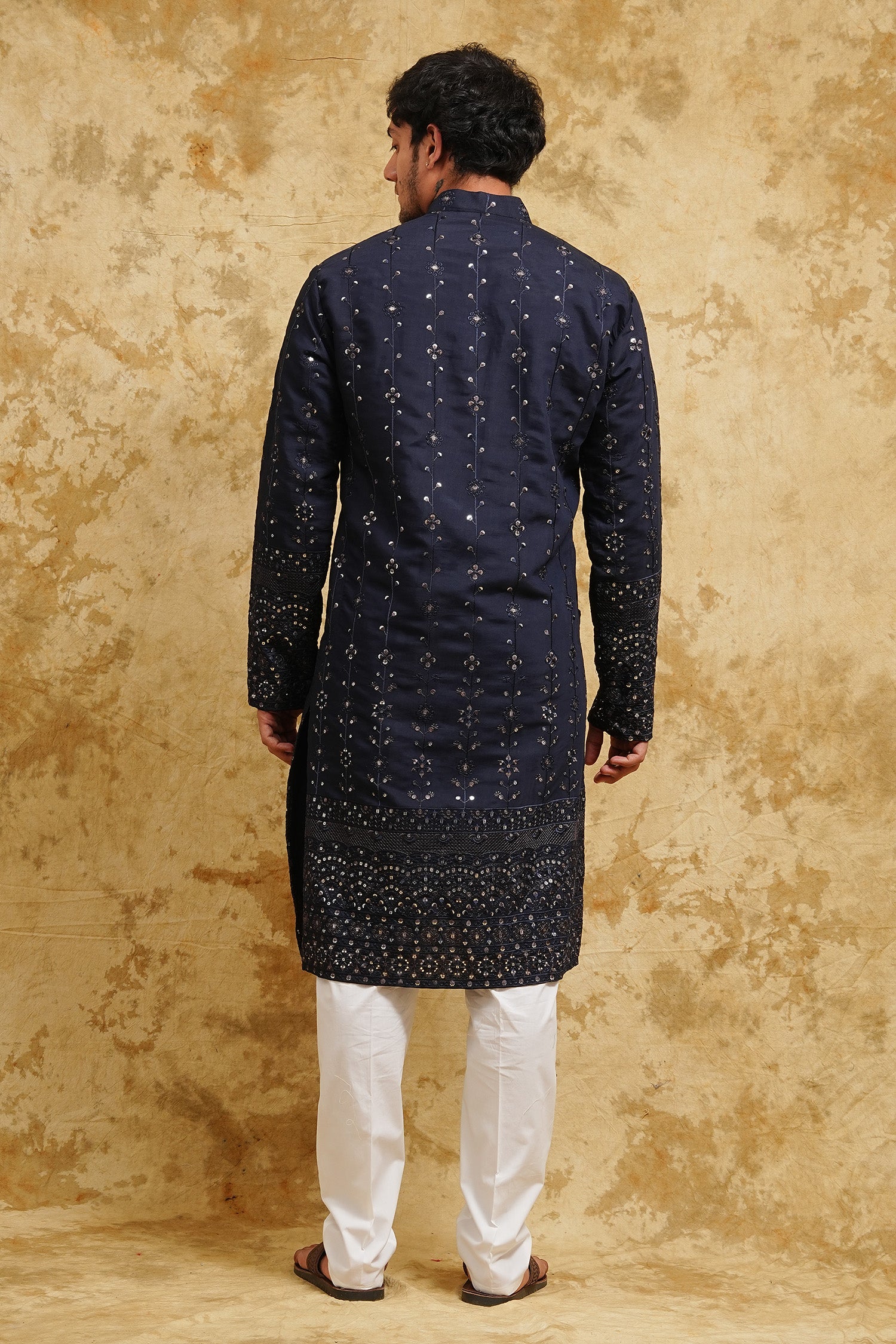 Bold, refined, and richly crafted—this Navy Blue Thread-Embroidered Kurta Set stands out with its intricate tonal embroidery that beautifully contrasts against the deep base color. The kurta features an elaborate heritage-inspired embroidered border and finely spaced motifs that add depth and elegance. The saturated navy tone gives it a majestic and celebratory appeal, making it perfect for evening functions and grand festivities. Designed with comfort and structure in mind, it offers a luxurious yet effortless festive look.