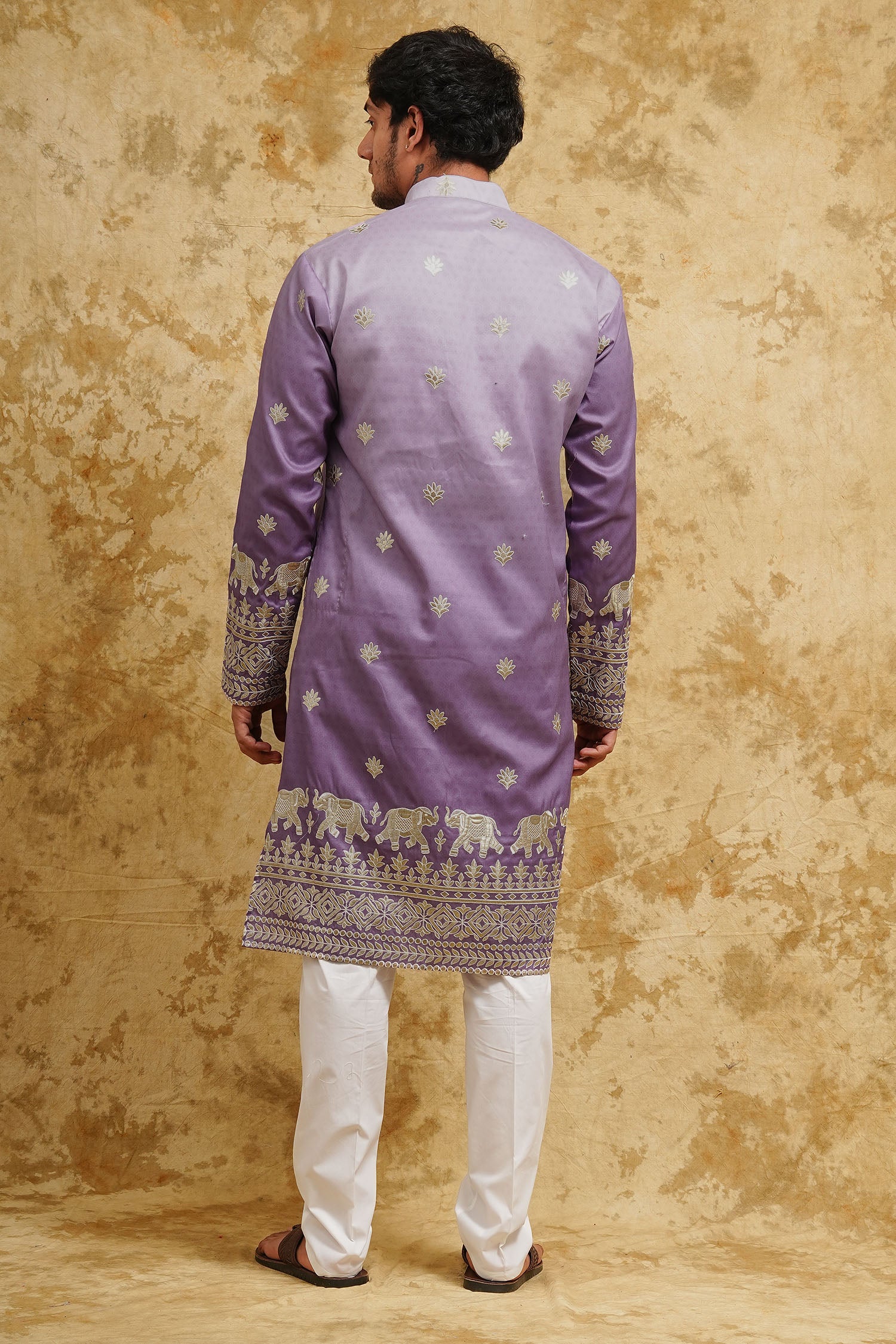 Soft, elegant, and rich in detail—this Purple Ombre Kurta Set features a subtle self-butti textured base with a gentle ombre effect, highlighted by intricate golden and white thread embroidery that gives a refined foil-like shine. The elephant motif border and delicate vine embroidery add a royal charm, making it perfect for daytime festivities, weddings, and traditional functions. Crafted in a smooth polyester blend with 100% cotton interlining for structure and comfort.