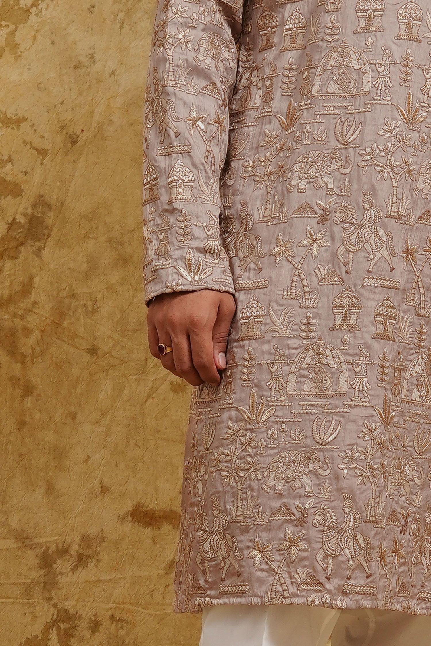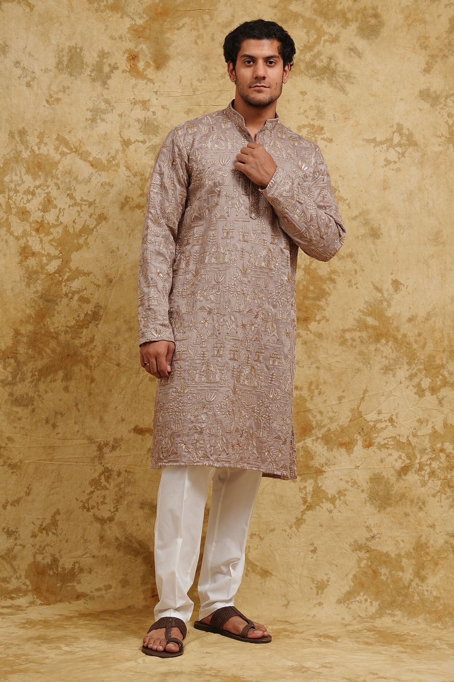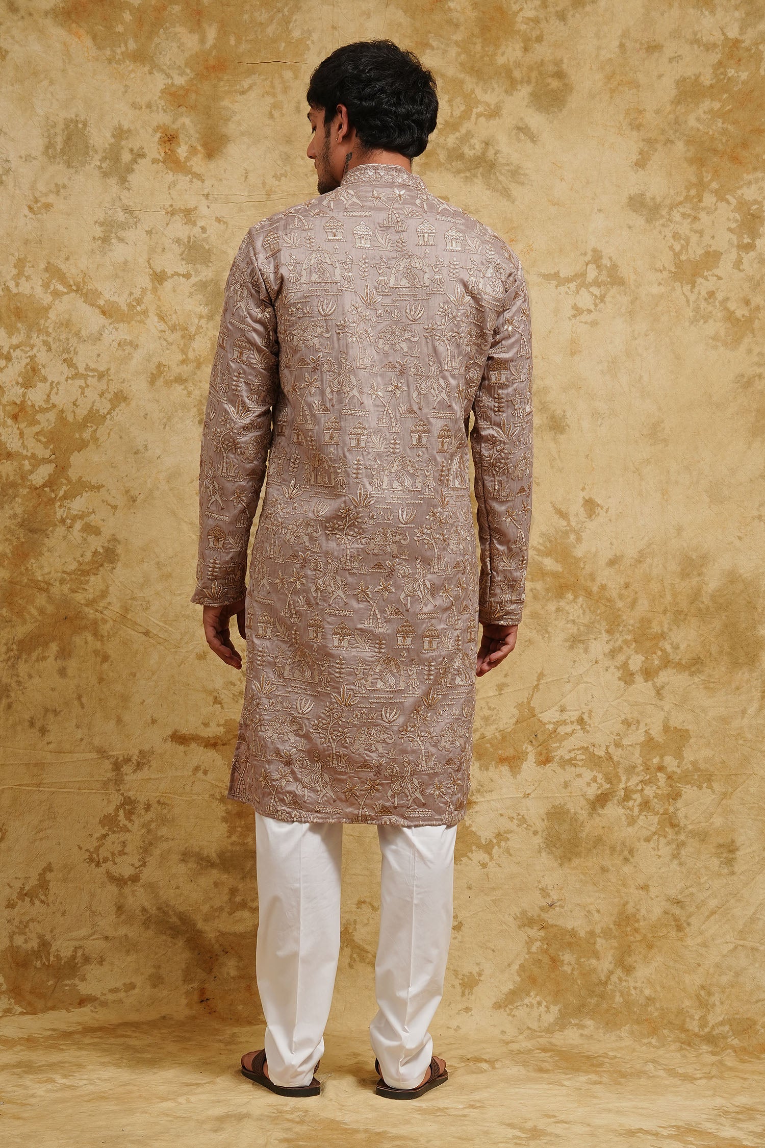 Rich, contemporary, and intricately handcrafted—this Taupe Gold All-Over Thread-Embroidered Kurta Set stands out with its dense, heritage-inspired embroidery that flows seamlessly across the entire silhouette. The warm taupe base is beautifully complemented by gold-toned threadwork, creating a luxurious textured look that feels both modern and rooted in tradition. The intricate motifs and architectural patterns add depth and artistry, making this kurta a statement piece for grand festive occasions. Tailored with a smooth finish and structured comfort, it delivers an effortlessly refined and regal presence.