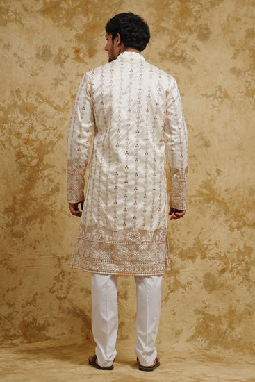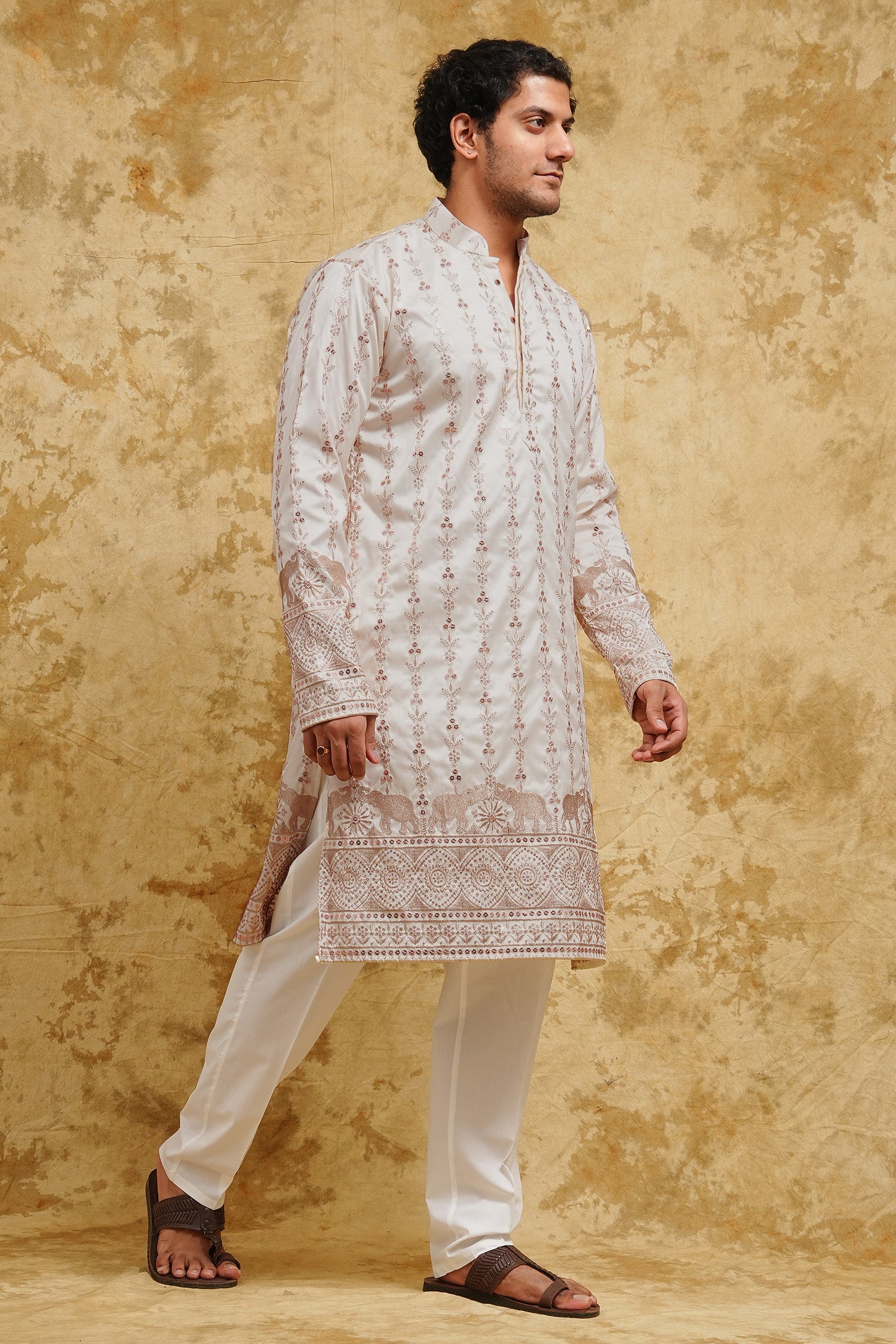 Elegant and timeless, this White Elephant Embroidered Kurta Set showcases delicate thread and sequin hand-style embroidery along the front panel. The subtle vertical vines paired with the ornate elephant border create a refined royal look. The white base brings out the shimmer of the sequins beautifully, making it perfect for daytime wedding functions, haldi events, and family celebrations. Enhanced with a polyester blend fabric and 100% cotton interlining for comfort and shape retention.