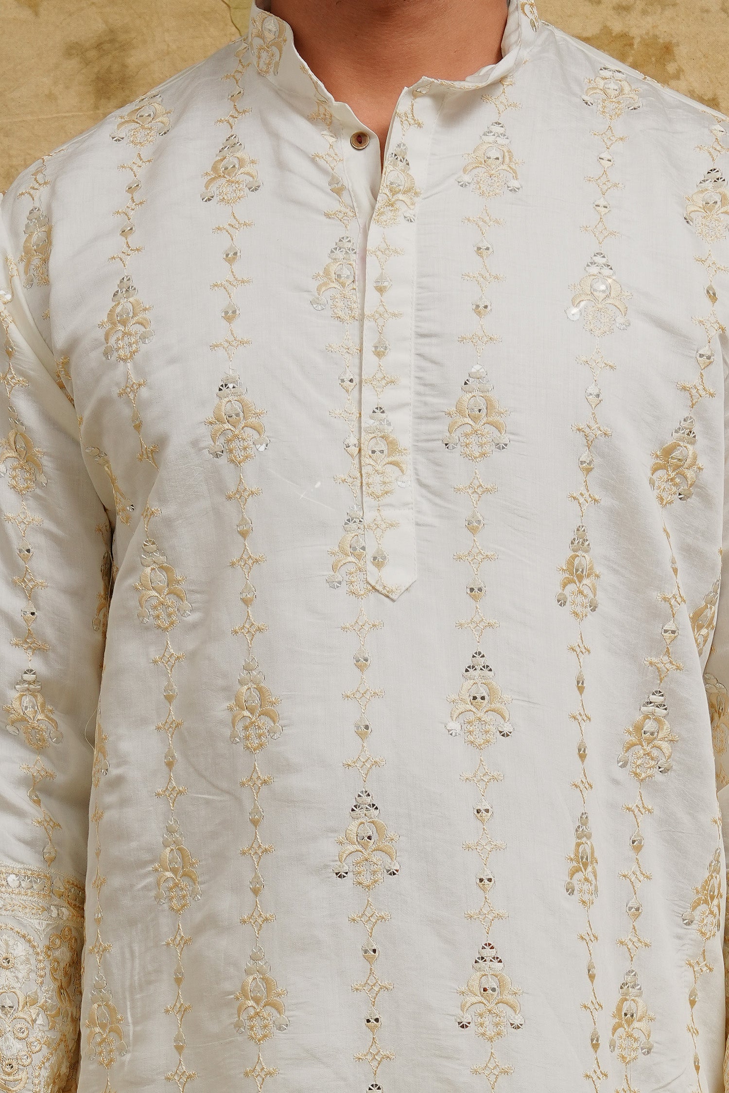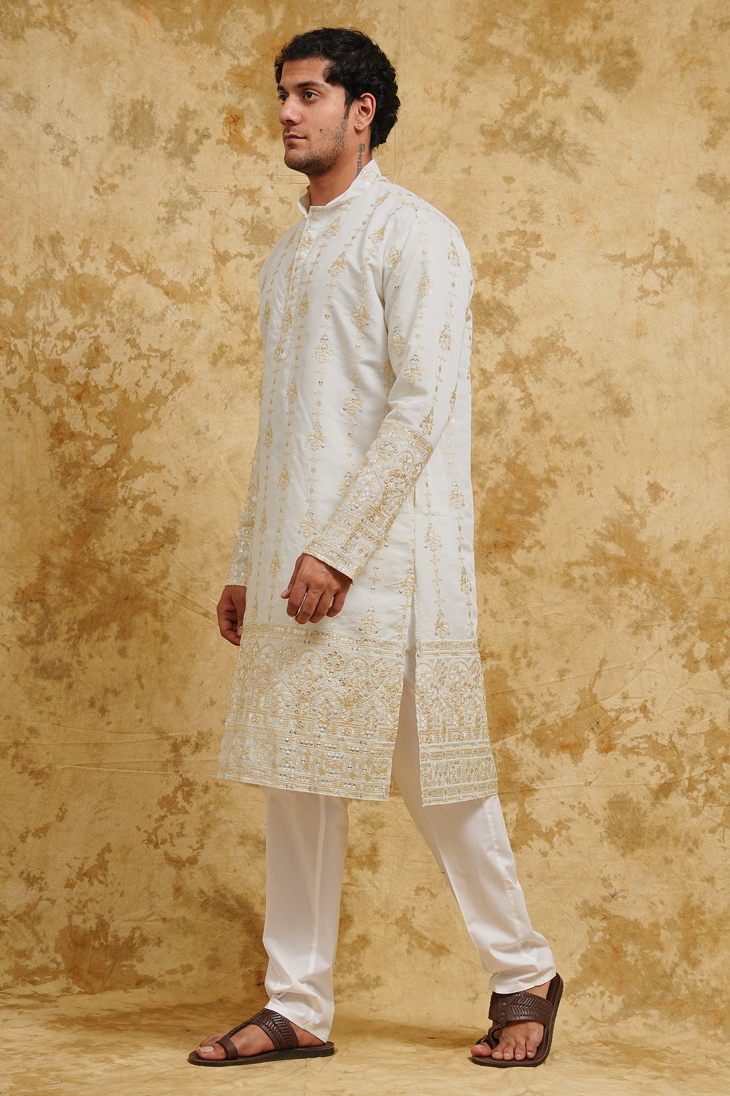 Elegant, serene, and timeless—this White Thread-Embroidered Kurta Set showcases delicate tonal embroidery arranged in graceful vertical motifs that enhance the kurta’s clean silhouette. The richly detailed architectural border work along the hem and cuffs adds a refined regal touch. Its crisp white base amplifies the intricacy of the embroidery, making it a sophisticated choice for daytime celebrations and traditional ceremonies. Tailored for comfort with a smooth finish, it offers a polished look suited for both festive and formal gatherings.